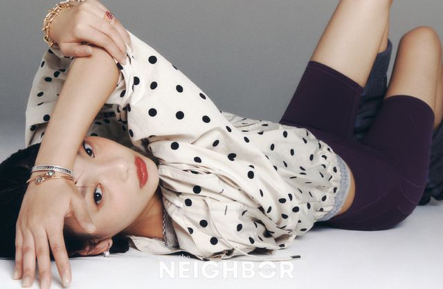폴카 도트 패턴 블루종 Jacquemus, 그레이 톱 Longchamp, 요가 쇼츠 Lululemon, 니트 슈즈 Grounds.