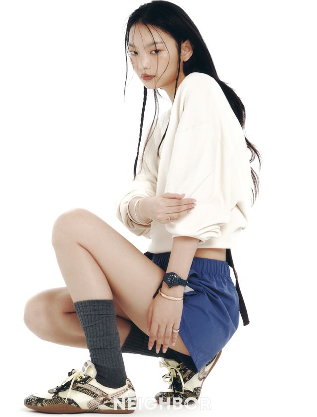 스웨트셔츠 Jil Sander, 레이어드한 톱 Margesherwood, 쇼츠 Patagonia, 스니커즈 Miu Miu, 삭스는 에디터 소장품.