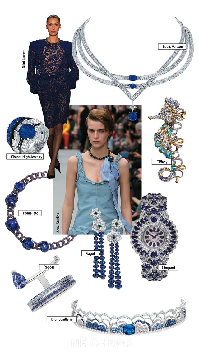 Pomellato 블루와 바이올렛 톤 사파이어를 체인 모티프 보디 전체에 파베 세팅하고 볼드한 퍼플 블루 컬러의 바로크 탄자나이트 5개를 장식한 일 그란데 블루 네크리스.