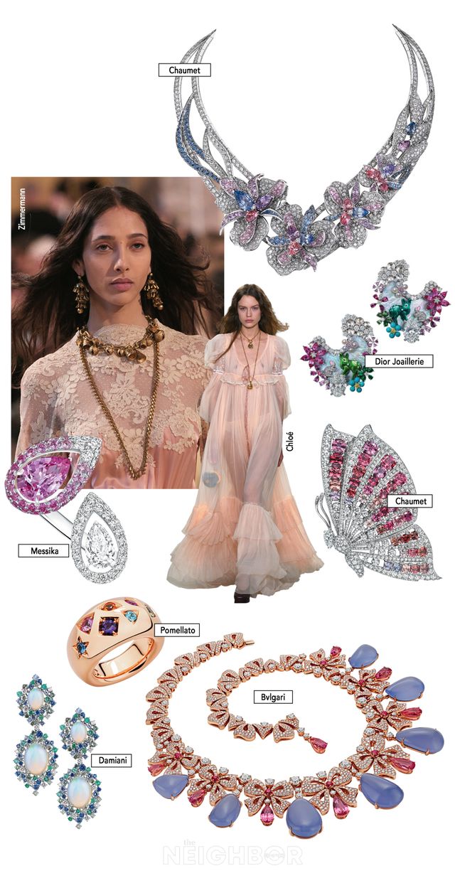 Chaumet 다이아몬드 네크리스 위로 블루·퍼플·핑크 컬러 스피넬을 파베 세팅한 꽃 다섯 송이를 더해 야생 아이리스의 아름다움을 구현했다.