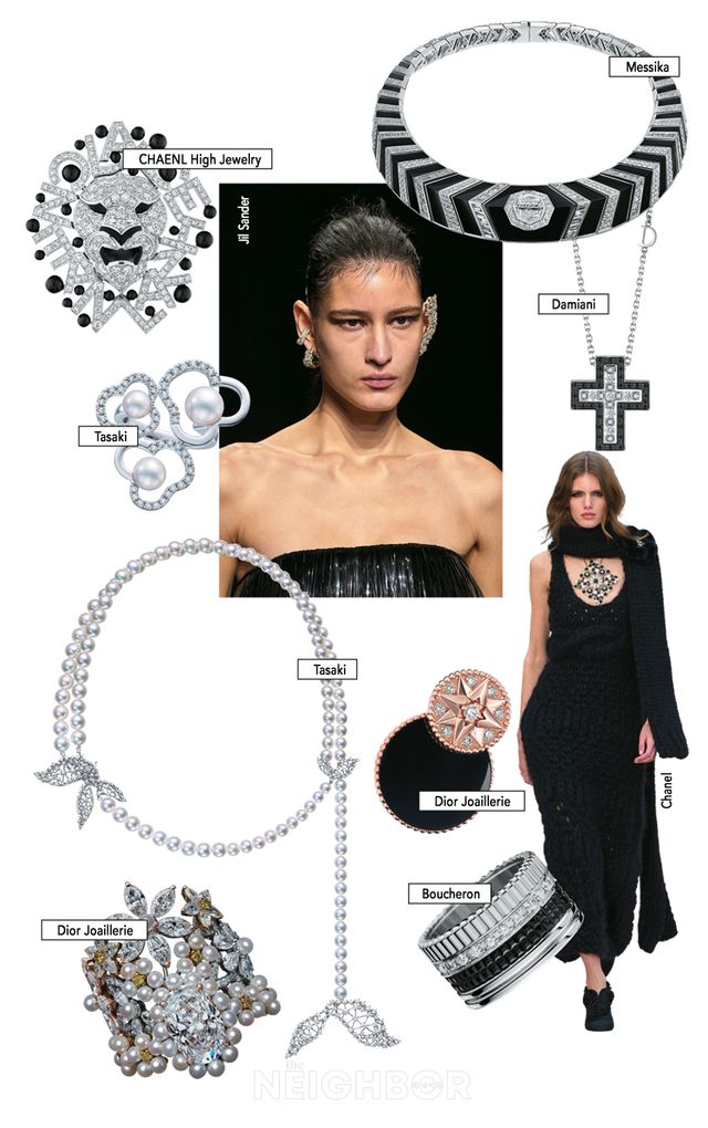 Messika 두 개의 실드 컷 다이아몬드를 중심으로 오닉스 보디에 바게트 컷과 브릴리언트 컷 다이아몬드를 교차 세팅해 얼룩말의 줄무늬를 구현한 네크리스.