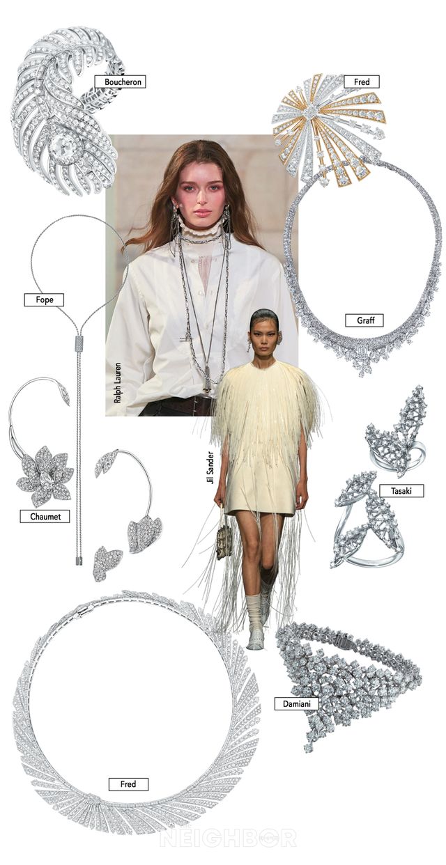 Fope 다이아몬드를 파베 세팅한 슬라이더를 더해 길이 조절이 가능한 화이트 골드 소재의 메시 롱 네크리스 1천9백만원대.