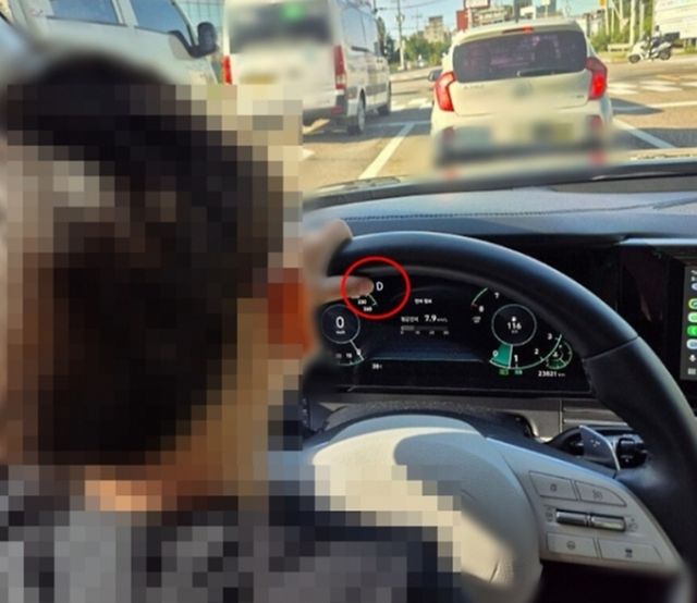 사진을 보면 10살도 안 돼 보이는 남자아이가 도로 위 차량 운전석에 앉아 핸들을 잡고 있는 모습이 담겨있다. 더욱이 기어가 'D(주행)'로 돼 있어 언제든 차량이 출발할 수 있는 위험한 상황인 것으로 추정된다.