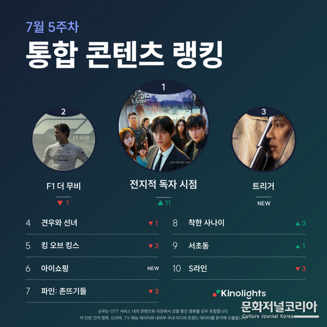 문화저널코리아 김영일 기자 | 7월 다섯째 주 주간 콘텐츠 랭킹에서 영화 <전지적 독자 시점>이 1위를 차지하였다.