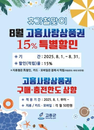 [파이낸셜경제=김예빈 기자] 고흥군은 본격적인 여름 휴가철을 맞아 소비 촉진과 소상공인 매출 확대를 통한 지역경제 활성화를 위해 8월 한 달간 ‘고흥사랑상품권’ 15% 특별할인 판매를 진행한다고 밝혔다.