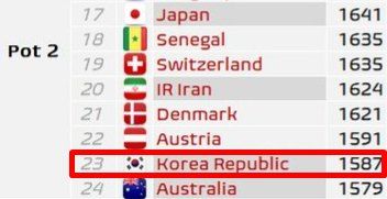 7월 기준으로 한국의 FIFA 랭킹은 23위다. 본래라면 포트3에 들어가지만, 현재 한국보다 FIFA 랭킹이 높은 국가들이 예선에서 고전해 월드컵 본선 직행이 불투명해지면서 한국이 수혜를 입을 가능성이 높아졌다. 호주, 에콰도르가 한국을 뒤쫓고 있지만 호주의 경우 뉴질랜드와 9월에 두 차례 평가전을 하는 등 상대국의 FIFA 랭킹이 높지 않아 이겨도 한국과 순위를 바꿀 수 있을지는 불투명하다.