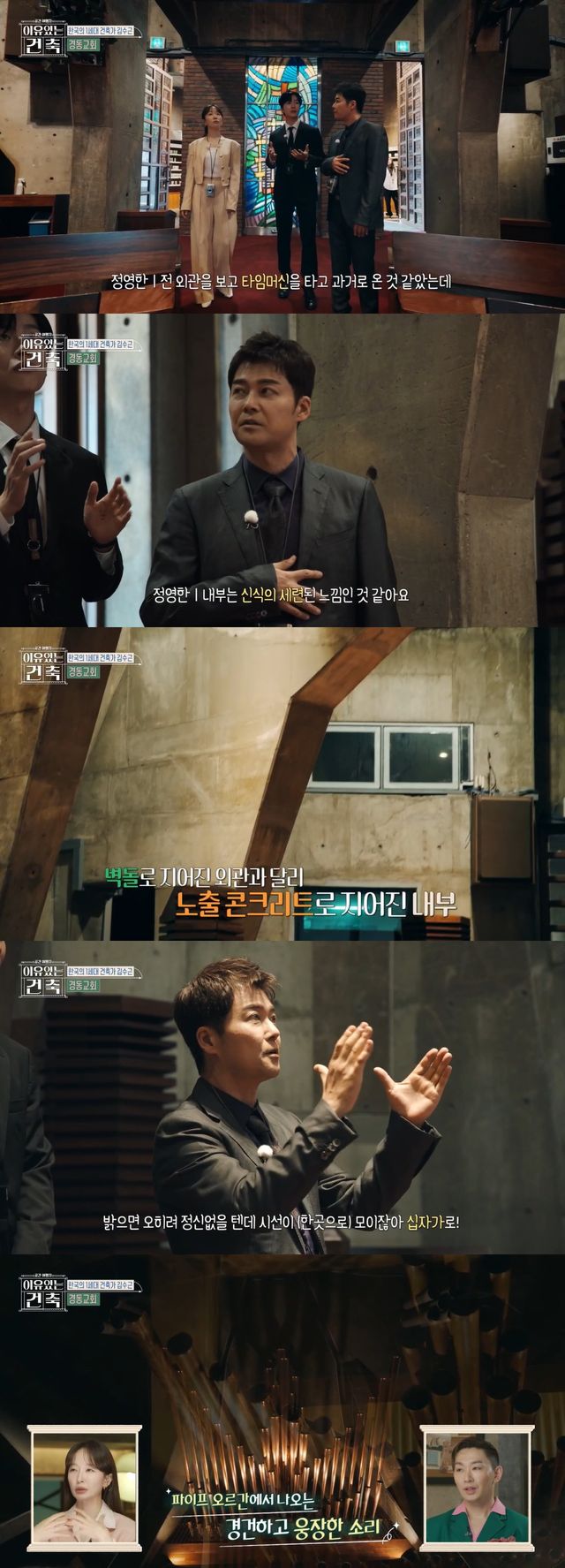 1981년에 완공된 김수근의 역작 경동교회를 찾은 세 사람. 정영한은 "외관은 타임머신 타고 과거로 온 거 같았는데 내부는 신식의 세련된 느낌인 것 같다"라며 노출 콘크리트로 지어진 내부에 감탄했다.