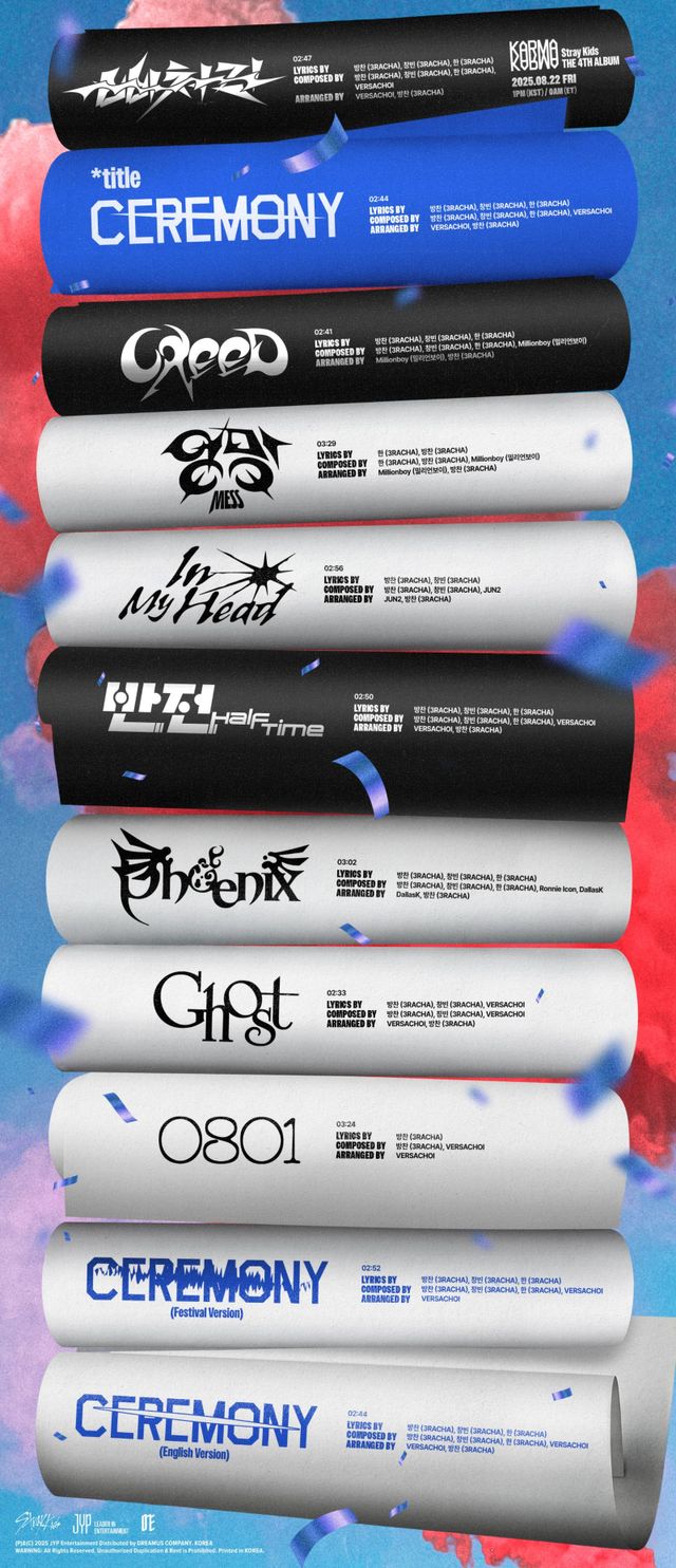 이번에도 그룹 내 프로듀싱 팀 쓰리라차(3RACHA)가 타이틀곡 ‘세리머니’를 포함한 전곡 크레디트에 이름을 올려 눈길을 끈다. 직접 만든 음악으로 미국 빌보드 ‘빌보드 200’ 6연속 1위 진입하며 차트 69년 역사 최초의 기록을 쓴 ‘레코드 메이커’ 스트레이 키즈는 손수 작업한 새 음악으로 올여름 전 세계 음악 시장을 강타한다.