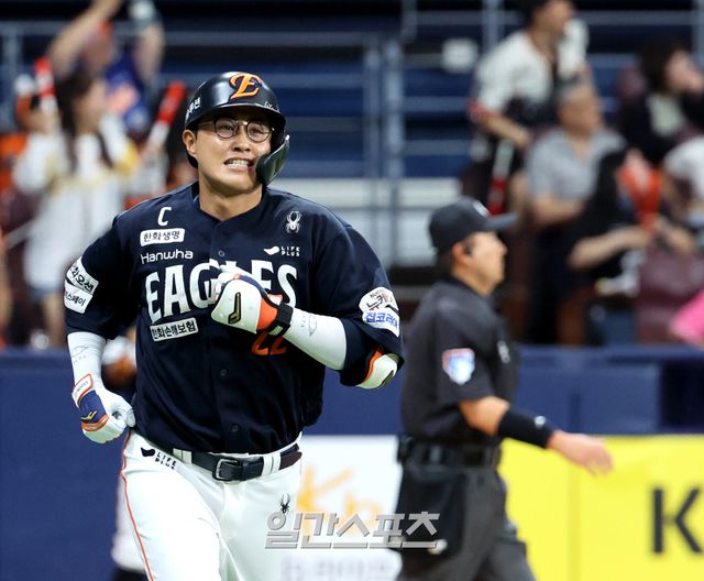 6일 오후 서울 고척스카이돔에서 열린 2025 KBO리그 프로야구 키움히어로즈와 한화이글스의 경기. 2회초 무사 1루 채은성이 투런홈런을 치고 1루로 달려나가고 있다. 고척=김민규 기자 mgkim1@edaily.co.kr /2025.07.06/