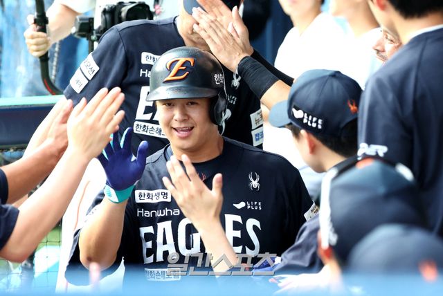 2025 KBO리그 프로야구 두산베어스와 한화이글스의 경기가 22일 오후 서울 잠실야구장에서 열렸다. 2회초 무사 노시환이 솔로홈런을 치고 홈인해 동료들의 축하를 받고 있다. 잠실=김민규 기자 mgkim1@edaily.co.kr /2025.07.22/