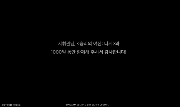 시프트업 ‘승리의 여신: 니케(이하 니케)’가 서비스 1,000일이라는 기념비적인 날을 마주했다. 게임은 30일 1,000일 기념 스페셜 애니메이션을 공개, 그간 이용자들을 울고 웃게 만들었던 게임 속 여정을 요약 소개하며 특별한 날을 축하한 모습이다.