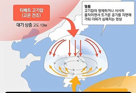 고온의 두 기압이 한반도에서 만나서 열돔을 형성.