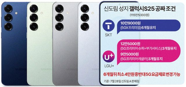 올 초 출시한 출고가 115만5000원의 삼성전자 '갤럭시S25' 256GB 기본형의 경우 SK텔레콤 10만9000원(5GX 프리미엄) 6개월 납부 조건을 내걸었다. LG유플러스는 12만5000원(5G 프리미어 슈퍼+부가서비스) 3개월 이후 9만5000원(5G 프리미어 레귤러) 3개월을 유지해야 한다.