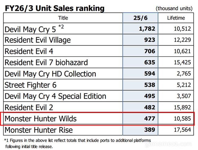 캡콤은 지난 7월 30일 2025 회계연도 1분기(2025년 4월~6월) 실적을 발표하며, 자사 주요 타이틀 분기별 판매량을 공개했다. 이에 따르면 몬스터 헌터 와일즈는 4월부터 6월까지 47만 7,000만 장이 판매됐다. 이를 토대로 몬스터 헌터 와일즈의 누적 판매량은 1,058만 장이 됐다.