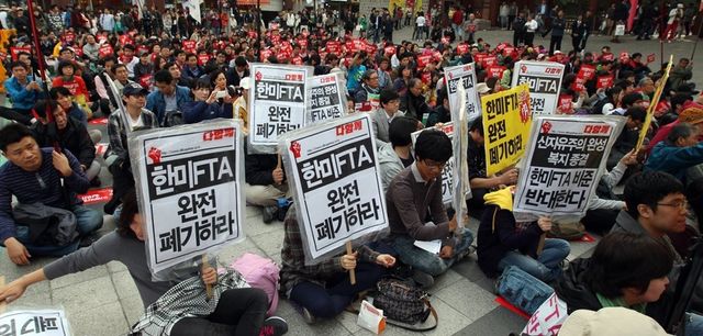 2011년 10월 9일 서울 태평로 덕수궁 앞에서 '진보 계열' 한미FTA저지 범국민운동본부 주최로 열린 '한미FTA 저지 결의대회'에서 참가자들이 팻말을 들고 구호를 외치고 있다. / 연합뉴스