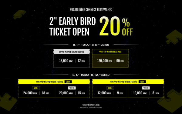 2차 얼리버드 티켓은 온라인 페스티벌, 오프라인 페스티벌(3DAY/1DAY), 비즈니스 패스 전 부문에서 20% 할인 혜택이 제공된다. 온라인 페스티벌과 비즈니스 패스는 8월 6일까지, 오프라인 티켓은 8월 12일까지 예매 가능하며, 모든 티켓은 BIC 공식 누리집을 통해 구매할 수 있다.