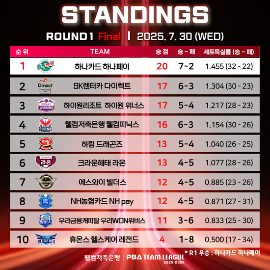 팀리그 2라운드는 8월 중순에 재개될 예정이다. 그사이 PBA는 오는 3일부터 '고양 킨텍스 PBA 스타디움'에서 2025-26시즌 3번째 투어 '올바른 카드생활 NH농협카드 PBA-LPBA 채리티 챔피언십'을 개최한다.