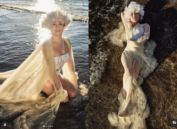 블랙의 웨딩드레스부터 여신을 떠오르게 만드는 시스루 비키니 드레스까지 완벽하게 소화했다.