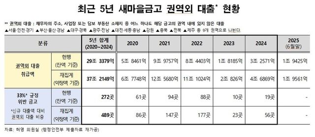 이에 새마을금고중앙회는 지난 2020년부터 금고의 권역외 대출을 당해연도 신규 대출액의 33% 이내로 관리하고 있는 것으로 알려졌다. 그러나 최근 5년간 이 규정을 위반한 금고는 272곳에 달했고, 이 중에는 권역외 대출 비율이 87.1%에 달한 금고도 있는 것으로 확인됐다.