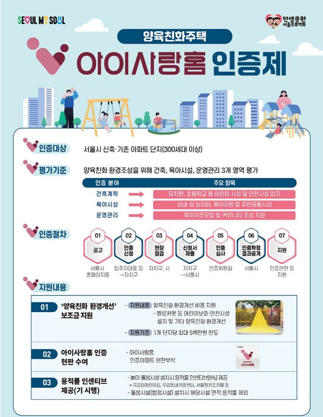 ‘양육친화주택 인증제’는 저출생 극복을 위한 ‘탄생응원 서울 프로젝트’의 주거 분야 대책의 하나로 지난해 8월 시작했다. 공공이 양육 인프라를 품은 아파트를 직접 건립·공급하는 내용의 ‘양육친화주택 ’ 사업(당산공영주차장 부지 380세대, 남부여성발전센터 부지 200세대)을 추진하는 동시에, 아이 키우기 좋은 환경을 갖춘 민간아파트를 시가 인증함으로써 공공과 민간이 균형을 맞춰 양육친화적인 주거환경을 조성한다는 취지다.