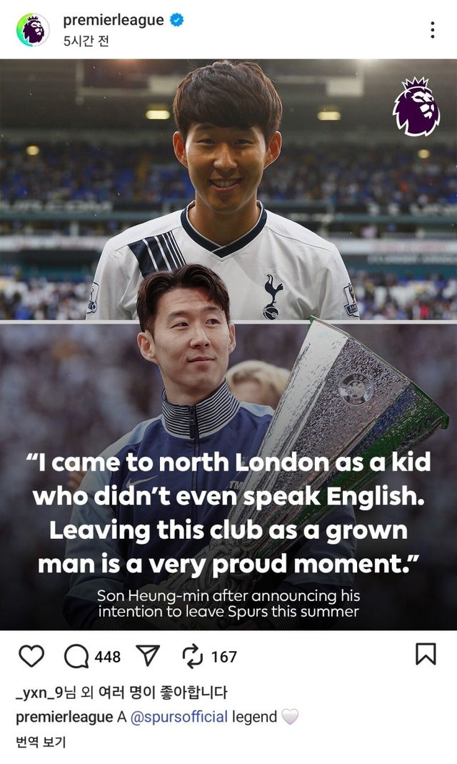 손흥민은 바로 이 우승 덕분에 숙제를 해내고 팀을 떠날 수 있다는 마음이 생겼다고 털어놓았다. 그는 기자회견에서 “토트넘을 떠나는 결정은 내 축구 커리어에서 가장 어려운 결정이었다. 10년이라는 시간 동안 가장 좋아했고, 사람으로서 가장 많이 성장한 곳이기에 감사한 마음을 갖고 있다”며 토트넘에 대해 애틋한 마음을 드러냈다.