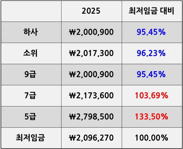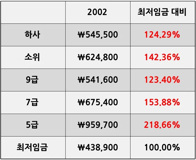 최저임금 대비로 보면 2002년 소위보다 2025년 5급이 못버는꼴 아니냐