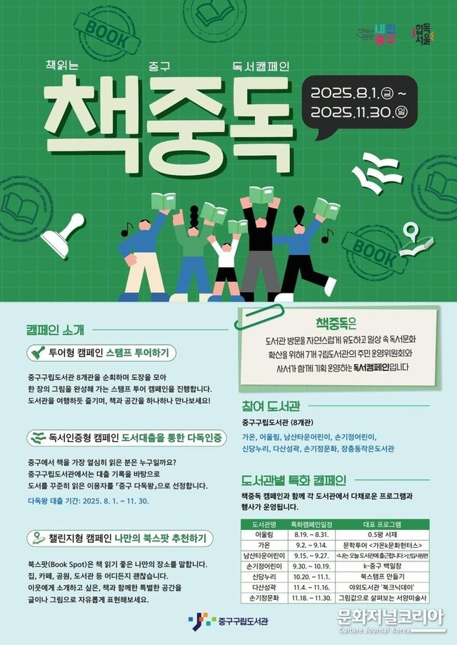문화저널코리아 김영일 기자 중구문화재단(이사장 김길성, 사장 조세현) 산하 중구구립도서관은 주민과 함께 기획하고 운영하는 독서캠페인 ‘책중독(책 읽는 중구 독서캠페인)’을 오는 8월부터 11월까지 운영한다.