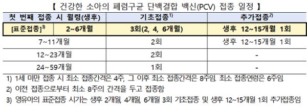 이로써 무료접종할 수 있는 폐렴구균백신은 PCV13, PCV15, PCV20 등 총 3종이다. 기존과 동일하게 생후 2, 4, 6개월에 총 3회 접종 후 12~15개월 1회 추가접종하면 된다. 단 이 시기를 놓쳐 접종이 지연된 경우 첫 접종 월령에 따라 총 접종횟수가 달라진다(상단 표 참고).