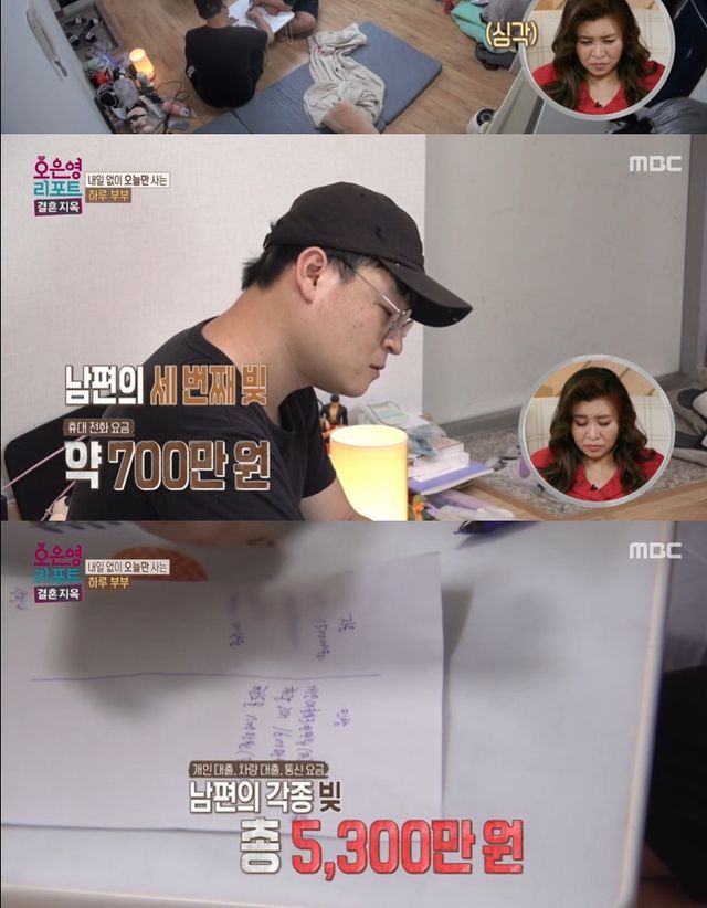 아내가 "얼마 남았는지 모르냐"고 묻자 남편은 "모른다. 계속 10만 원씩 나가고 있으니까 3천만 원이라는 것만 알고 있다"고 답했고, 이어 차량 구매로 인한 약 1,600만 원의 빚과 휴대 전화 요금 약 700만 원의 빚이 밝혀지자 스튜디오에서는 "핸드폰 요금이 7백이라고?"라며 깜짝 놀란 반응이 이어졌다.