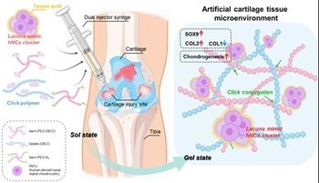(그림 설명 : 사람 유래 비중격 연골세포와 클릭 화학 기반 하이드로겔 이용한 연골의 라쿠나 구조를 모사한 연골 재생 기술 모식도)