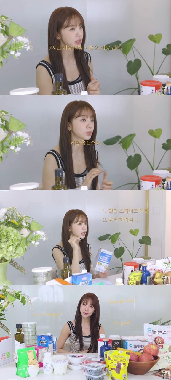윤은혜는 "7시간 이상 자는 것과 2L이상의 물을 마시는 건 기본 옵션"이라며 "간헐적 단식을 하는게 확실히 좋다. 잠자는 시간에 1, 2시간 기준으로 16:8(비율로 간헐적 단식을 한다). 눈을 뜨자마자 두 시간 정도만 참으면 된다"라고 설명했다.