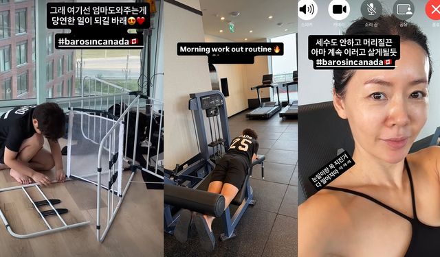 캐나다 국기 이모티콘까지 덧붙인 안선영은 이어 아침에 헬스장에서 아들과 함께 운동 중인 모습을 공유했다.