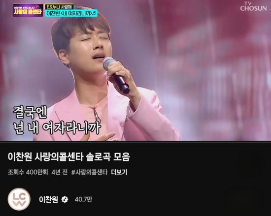(엑스포츠뉴스 이정범 기자) 이찬원의 '사랑의 콜센타' 솔로곡 모음 영상이 조회수 400만 회를 돌파했다.
