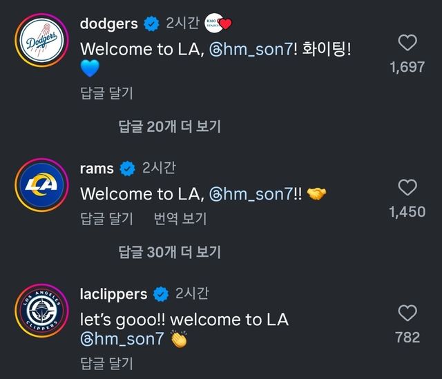 미국프로풋볼 구단인 LA 램스도 한글로 'LA에 오신 것을 환영합니다'라며 악수 이모티콘을 댓글에 집어넣었다.