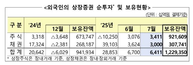 7일 금융감독원에 따르면 7월 외국인 투자자는 국내 상장증권을 총 6조4110억원 순투자했다
