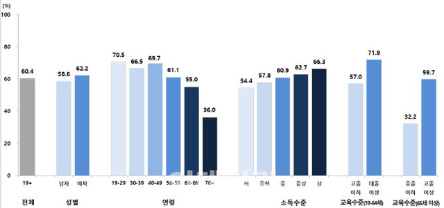 이번 논문은 2023년 국민건강영양조사에 참여한 성인 5906명의 자료를 분석한 결과로, 우리나라 성인의 60.4%가 적절 수준의 건강정보 이해능력을 갖춘 것으로 확인됐다. 평균에 못 미치는 연령은 60~69세(55.0%)와 70세 이상 어르신이었다. 이와 함께 여자(62.2%)가 남자(58.6%) 보다 건강정보 이해능력이 높았으며, 소득 수준과 교육 수준이 높을수록 높았다.
