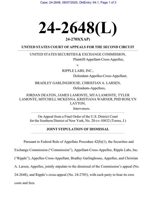 사본에 따르면 양측은 교차항소를 종료함과 함께 비용을 각자 부담하기로 결정했다. 미국 증권거래위원회와 리플랩스는 지난 2024년 교차항소를 진행한 바 있다. ‘증권법 위반’을 골자로 했던 소송전에서 리플랩스가 지난 2023년 약식 판결로 대다수 승소한 것을 미국 증권거래위원회가 불복해 진행된 항소였다.