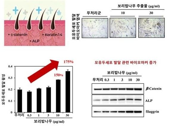 세포 실험에서 보리밥나무 추출물을 10㎍(마이크로그램·100만분의 1g)/㎖ 농도로 처리했을 때 모유두세포 활성이 150%, 30㎍/㎖에서는 175% 각각 증가한 것으로 조사됐다. 모유두세포와 관련된 바이오마커(체내 변화를 알아낼 수 있는 지표) 역시 보리밥나무 처리 농도가 높아질수록 증가하는 것으로 확인됐다.