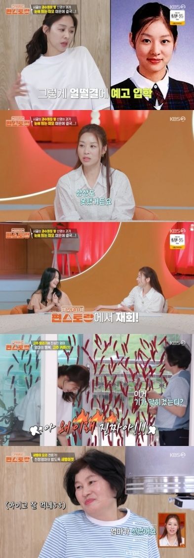 장신영은 “전교생이 (이정현) 선배님 보려고 난리가 났었다”라며 “그 이후로 처음 뵙는 거다. 나의 우상이던 선배님이 앞에 계시다니 너무 신기하다”라고 말했다. 이정현은 놀라며 “기억난다”라고 말했다. 마주 보며 웃는 두 사람의 모습이 흐뭇한 미소를 유발했다.
