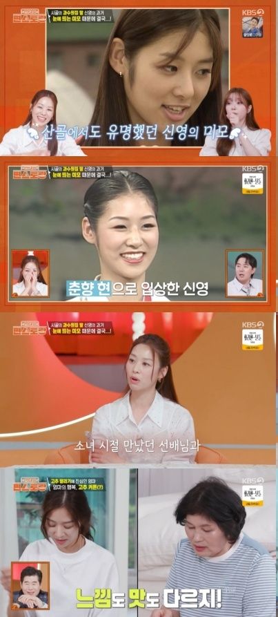 장신영의 친정 엄마는 “우리집이 포도 과수원을 했다”라며 “동네 사람들이 신영이 보고 나중에 크면 미스코리아 시키라고 했다”라고 회상했다. 장신영은 “아니야. 나 촌스러웠어”라며 쑥스러운 듯 미소 지었다.