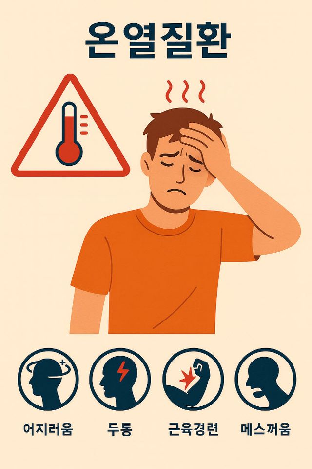 온열질환은 높은 기온 환경에 장시간 노출되었을 때 체온조절 기능이 제대로 작동하지 않으며 발생하는 다양한 증상을 의미한다. 흔히 가벼운 증상으로는 땀을 많이 흘린 후 생기는 근육경련인 열경련이나, 땀샘이 막혀 나타나는 열발진 같은 증상이 있다. 나아가, 대량의 수분과 염분 손실로 어지럼증, 두통, 구토, 극심한 무기력감이 동반되는 열탈진, 더 나아가 체온이 40도 이상으로 상승하고 의식이 흐려지는 열사병까지 다양하다.