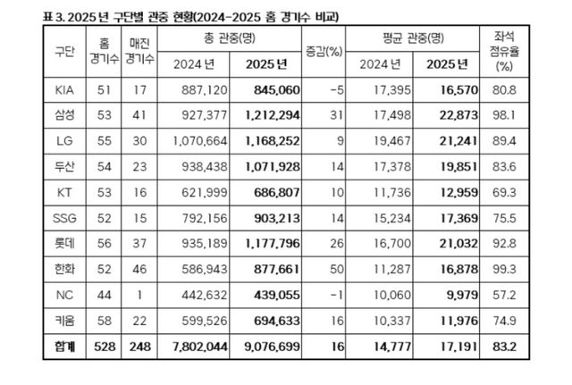 올 시즌 좌석 점유율은 83.2%다. 평균 관중은 1만 7191명으로 지난해 동일 경기 수 대비 약 16% 증가했다.