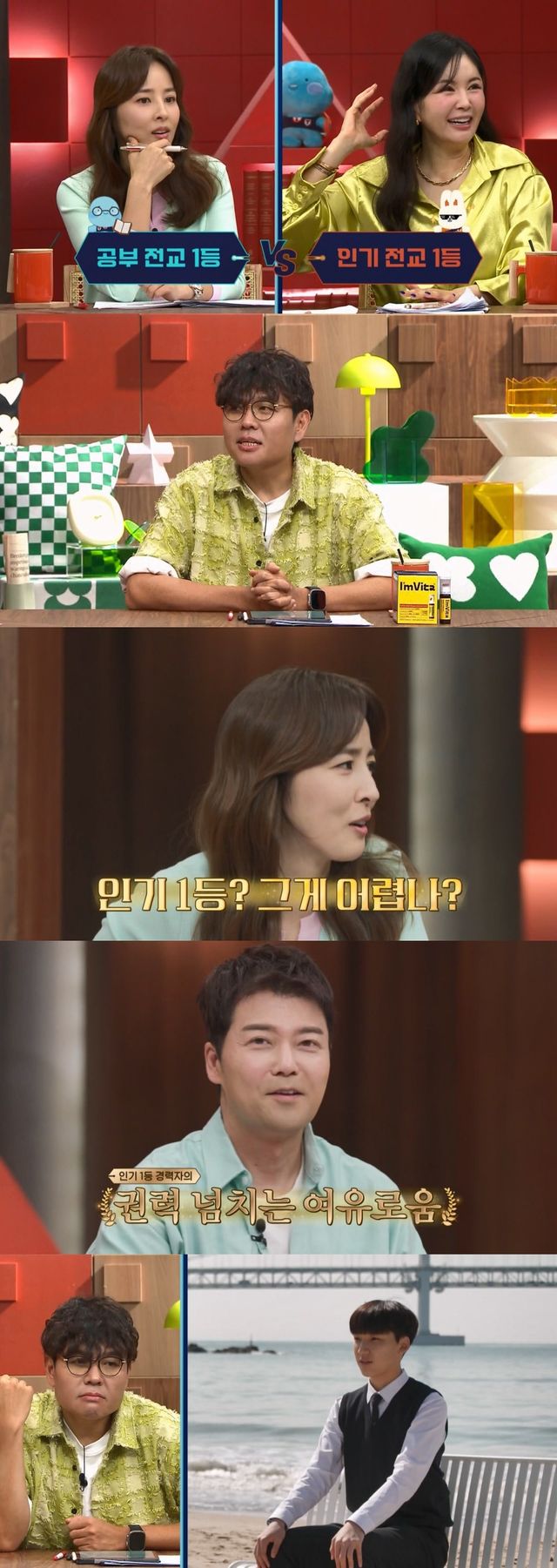 반면 장영란은 “나는 무조건 공부 전교 1등이다. 공부 한 번 진짜 잘해보고 싶다”라고 답했다. 한혜진은 “저도 무조건 공부 전교 1등이다”라며 공감했다. 그러자 ‘티벤저스’ 듀오 정승제X조정식은 “이미 인기 1등은 해봤으니까?”라며 합리적 추측을 했다.