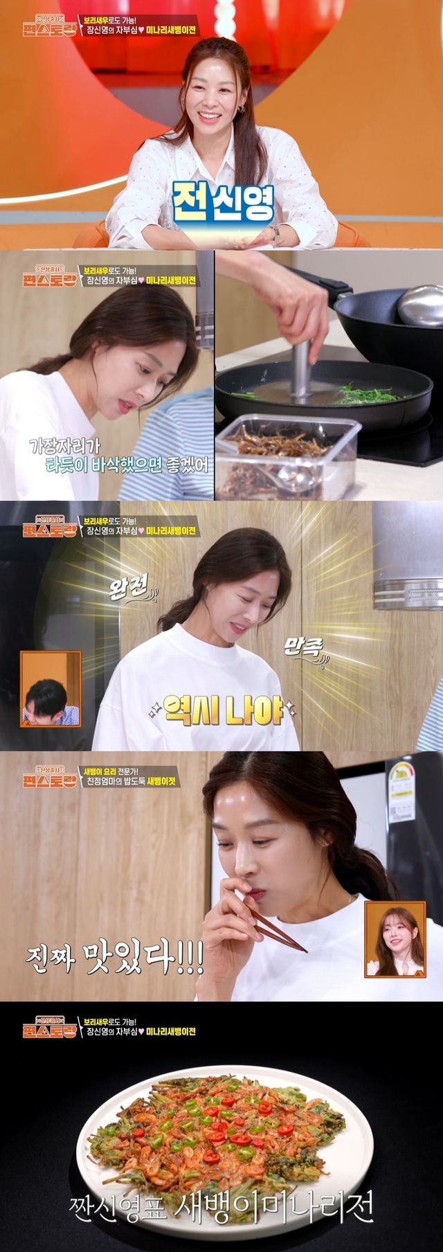 특히 장신영의 미나리새뱅이전이 시선을 강탈했다. 전에 진심인 장신영은 호떡 누르는 조리도구까지 꺼내 바삭바삭 꿀맛 미나리새뱅이전을 부쳐냈다. 이를 본 ‘편스토랑’ 식구들 모두 “전신영이다”, “정말 먹고 싶다”, “이거 美쳤다”라며 감탄을 쏟아냈다.