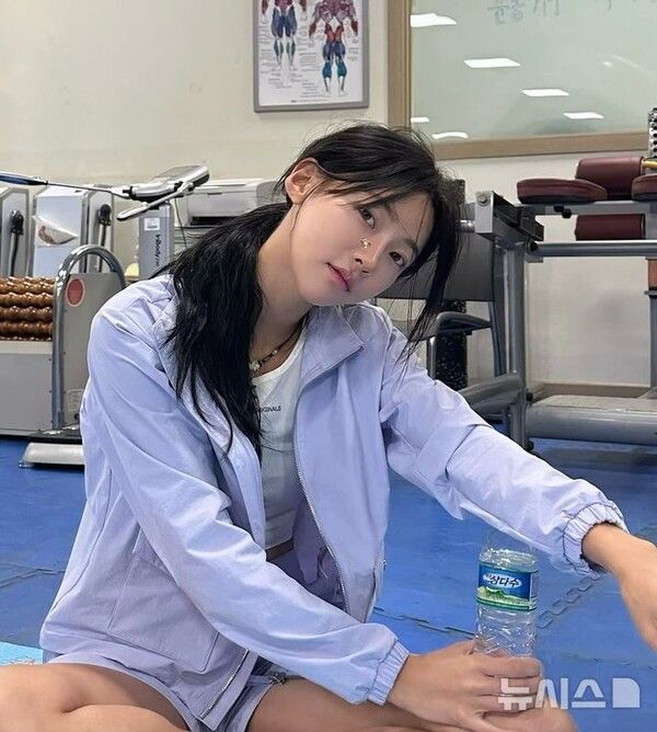 공개된 사진에서 김민지는 막 운동을 마치고 휴식을 취하는 듯한 분위기로 실내 체육관 바닥 위에 앉아 자연스러운 포즈를 취했다.