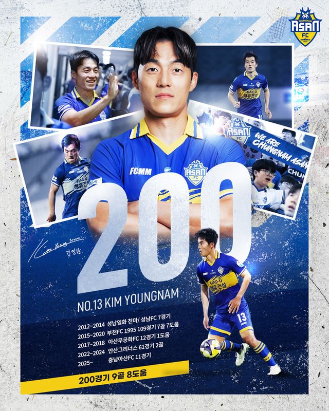 한편, 충남아산FC는 오는 24일(일) 오후 7시 이순신종합운동장에서 치르는 ‘하나은행 K리그2 2025’ 26라운드에서 김영남의 200경기 출장 시상식을 진행할 예정이다.