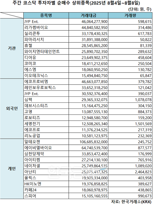 기관 'JYP Ent.'·외인 '에코프로비엠'·개인 '알테오젠' 1위 [주간 코스닥 순매수- 2025년 8월4일~8월8일]