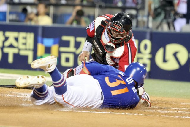LG 포수 박동원이 공을 잡은 뒤 미트로 홈플레이트를 분명 막고 있었다. 손아섭은 헤드 퍼스트 슬라이딩을 하며 두 팔을 살짝 벌렸다. 왼팔을 쭉 폈다가 접는 동시에 오른손으로 홈플레이트 빈틈을 파고들었다. 비디오 판독을 거쳐도 손아섭의 득점은 달라지지 않았다.