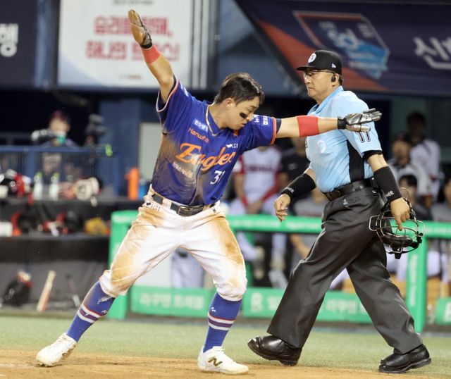이어 등판한 LG 김진성이 폭투와 희생플라이를 내줘 한화는 3-2로 달아났다. 이어진 1사 3루에서 한화 3번 문현빈이 1루수 앞 땅볼을 쳤다. LG 1루수 천성호가 던진 공이 3루 주자 손아섭보다 먼저 도착했다. 그런데 판정은 세이프.