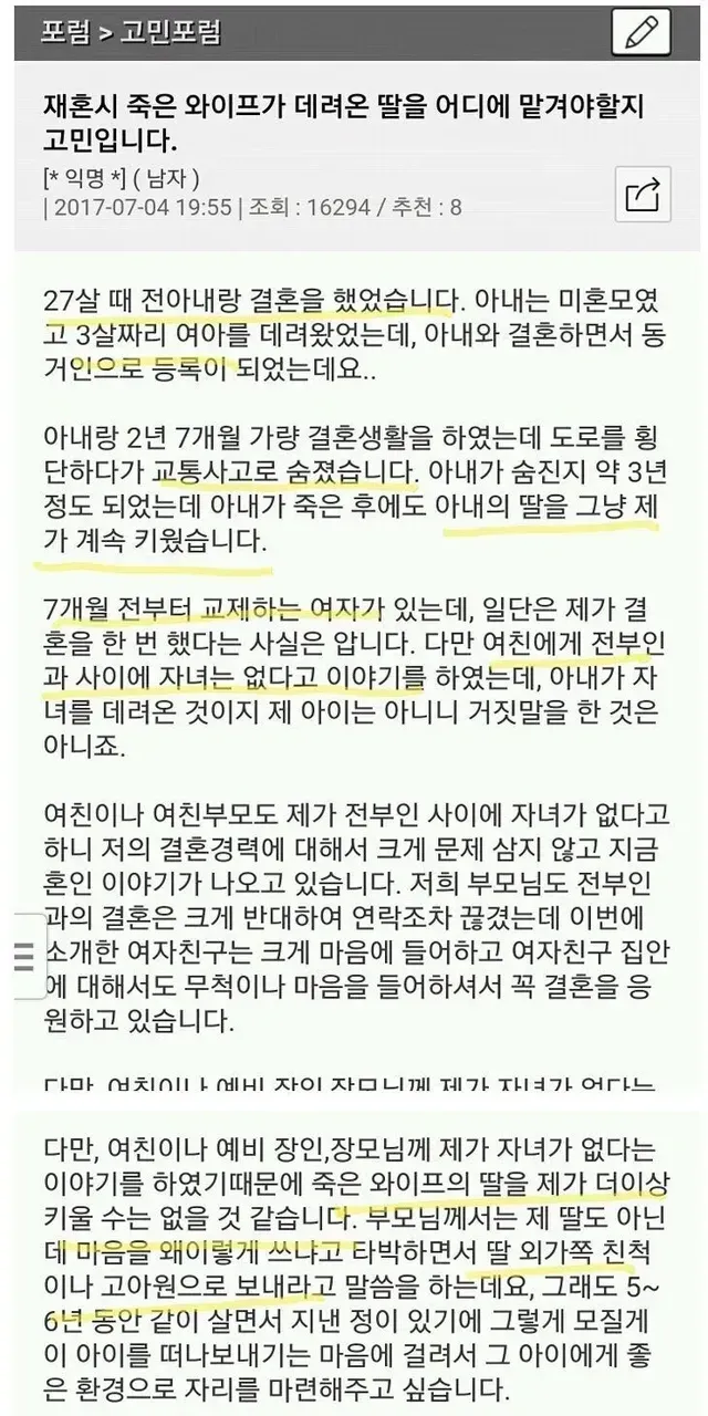 재혼시 죽은 와이프가 데려온 딸을 어떻게 할지 고민인 남자,,
